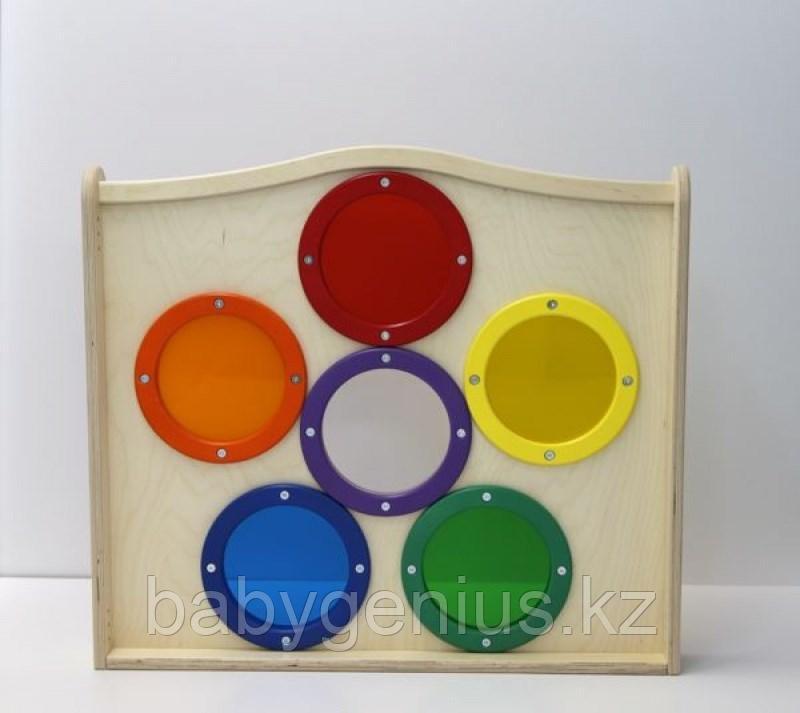 В фасад панели вмонтированы 6 акриловых стекол разных цветов. Панель станет украшением любой игровой зоны, а также отличным дидактическим материалом для изучения цветов.