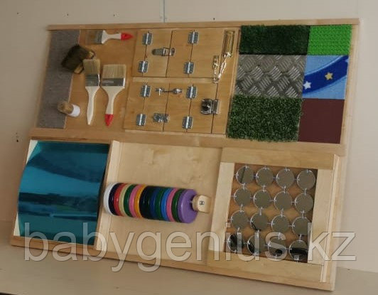 3. Текстуры панель включает в себя 6 тактильных покрытий: щетка, ворс, ковер, алюминий. Данные элементы панели применяются для развития мелкой моторики у ребенка, освоения навыков осязания.